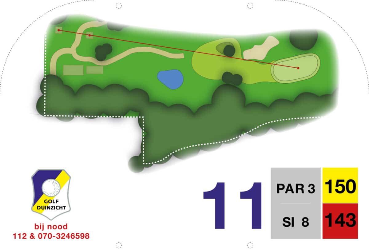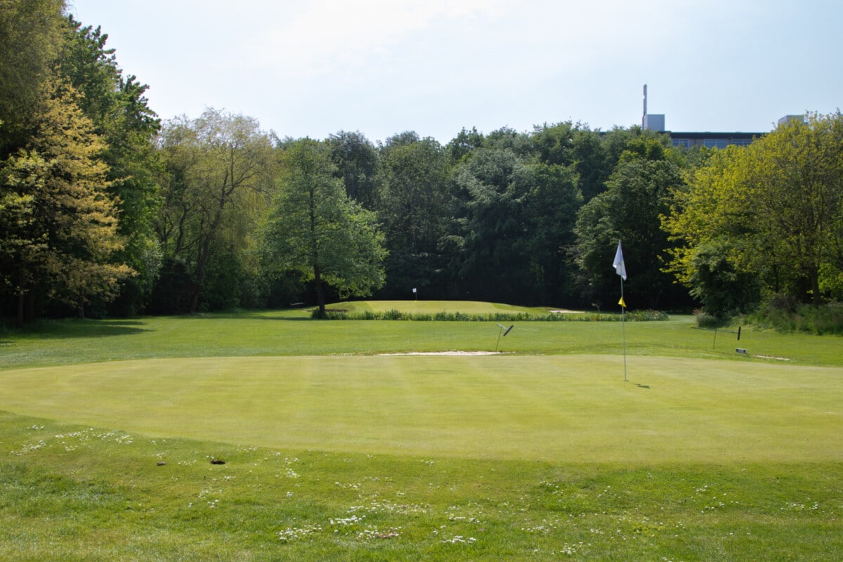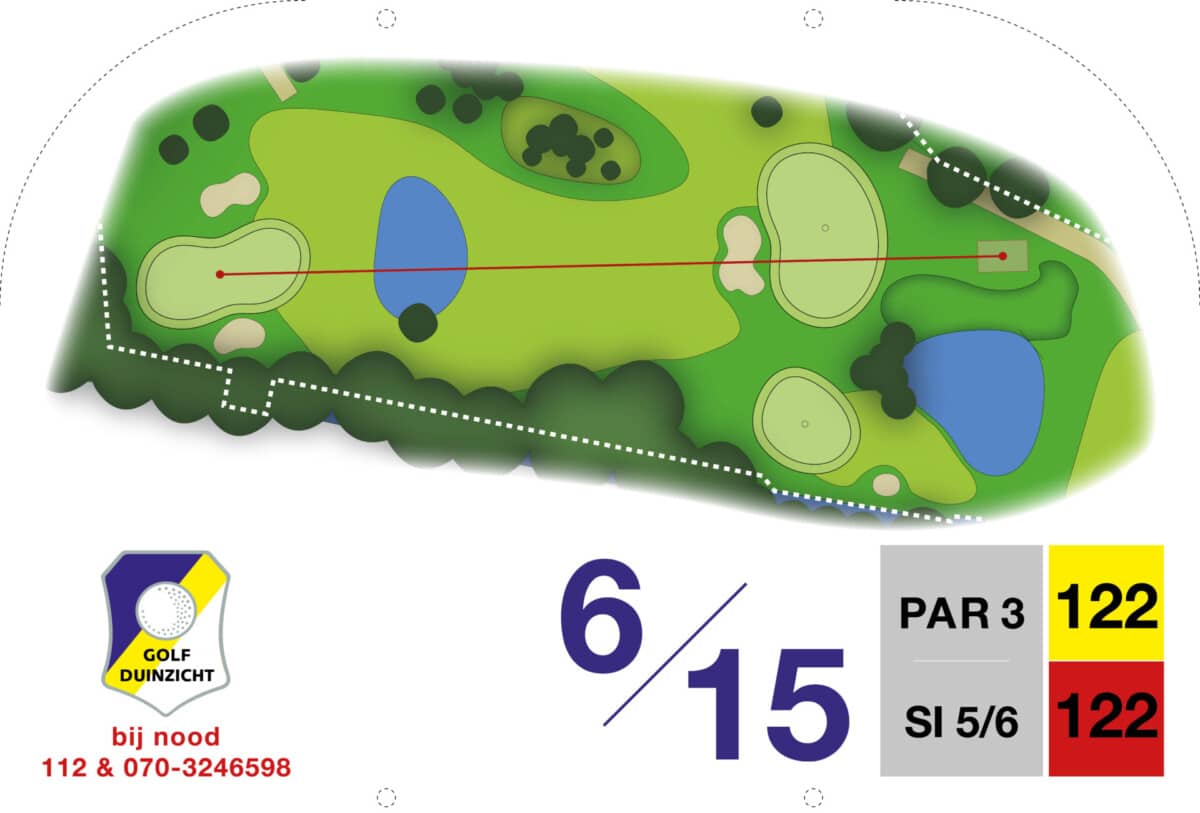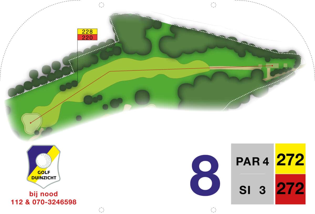 Vanaf de verhoogde tee worden de uitdagingen meteen duidelijk. Een vijver op 85 meter in de lijn naar de green, daarnaast is de green beschermd door twee bunkers. De green zelf heeft twee niveaus met een hoogteverschil van net geen meter. Het hoge niveau is klein en moeilijk aanspeelbaar. Bij de afslag heeft hole 7 voorrang. Op zich een rechttoe rechtaan hole, maar schijn bedriegt. Het hek links langs de hole is out of bounds, de green is lastig aanspeelbaar en wordt beschermd door een bunker rechts voor. De verhoogde green zorgt voor veel uitdaging om de bal erop te houden.