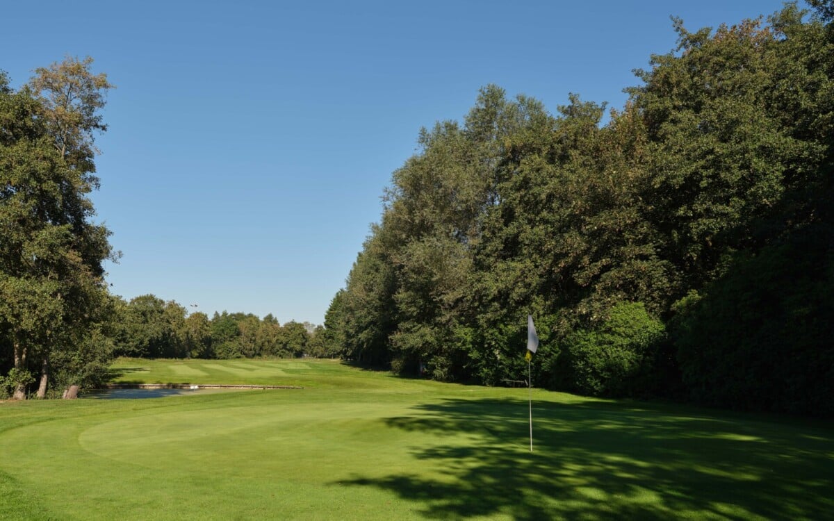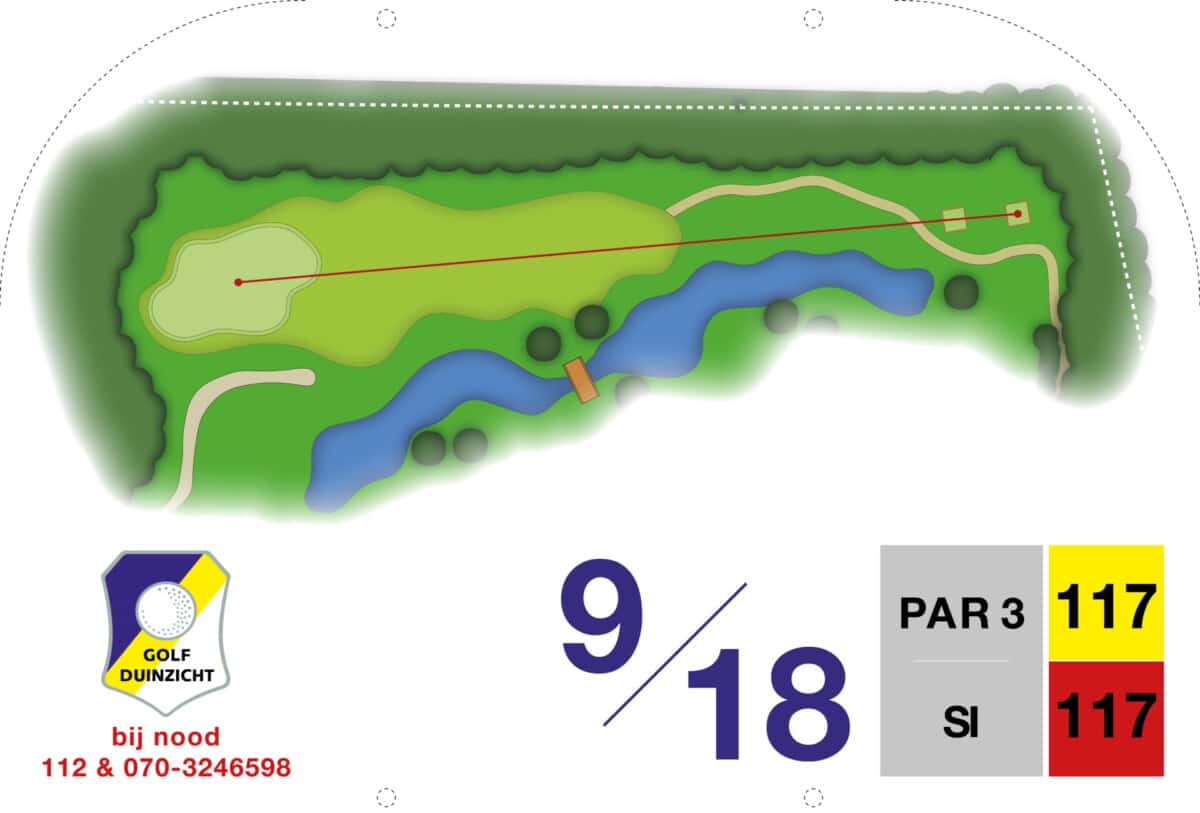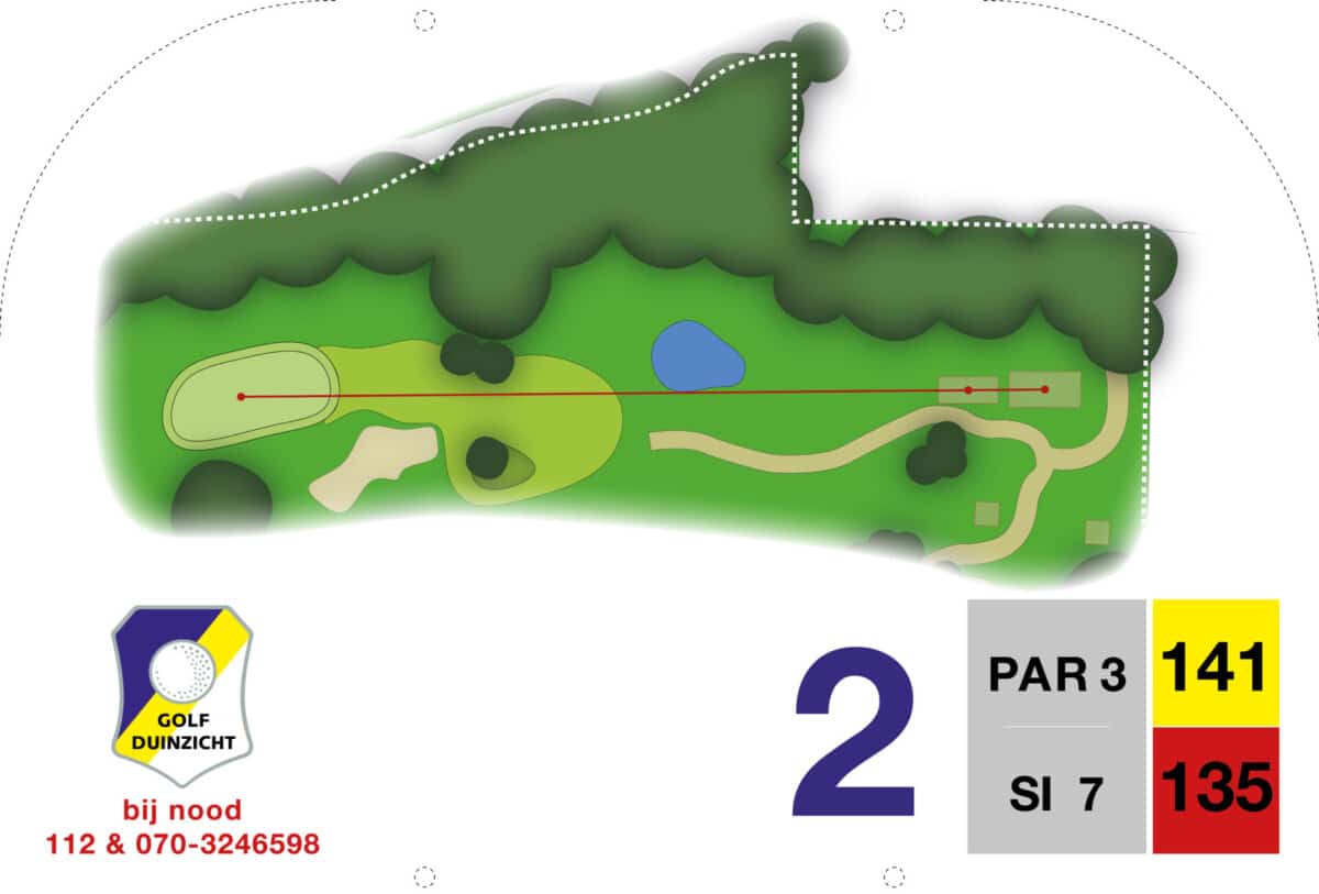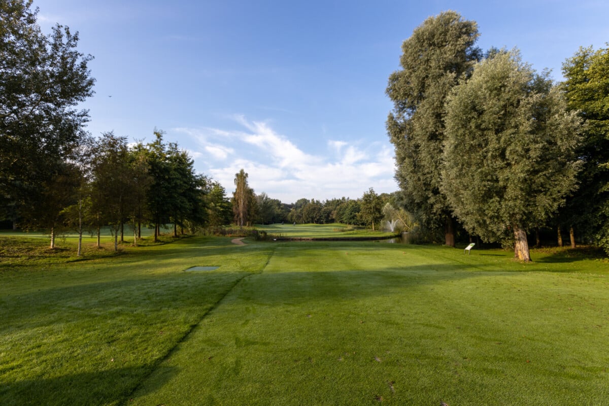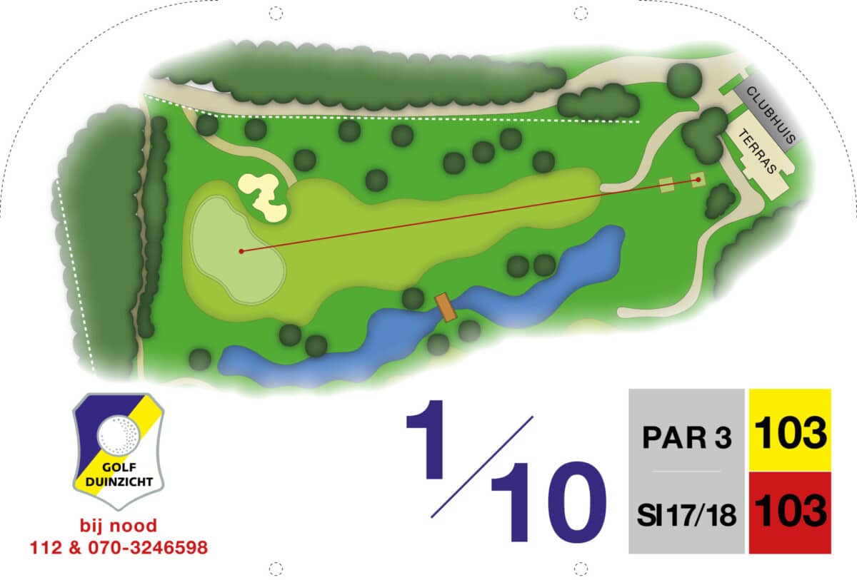 De eerste par 4 met niet voor niets een stroke index 1 en 2. Een smalle fairway met zowel links als rechts out of bounds. De fairway bunker op rechts is tactisch geplaatst, daarnaast ligt de green tegen de linker out-of-boundslijn aan en is verder beschermd door een vijver rechts voor op 195 meter van de tee. Dan is er nog een kleine potbunker links voor de green. Al met al een zeer uitdagende hole die een goede strategie vergt.